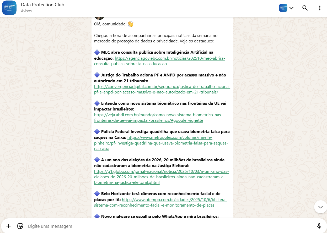 A privacidade está em constante transformação — e quem atua na área sabe o quanto acompanhar tudo é um desafio. O Data Protection Club é uma comunidade no WhatsApp voltada para profissionais de privacidade, proteção de dados, compliance, jurídico e segurança da informação que querem se manter informados e conectados com o mercado.