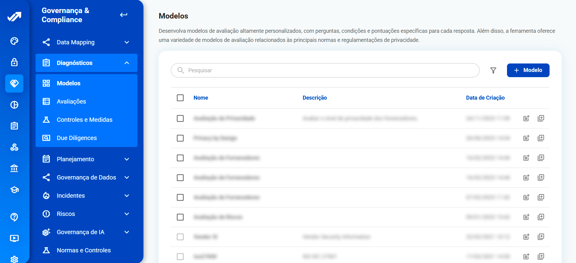 O módulo Diagnósticos da Privacy Tools permite estruturar e aplicar avaliações sob medida, com controle total sobre critérios, lógica de pontuação e rastreabilidade dos resultados.