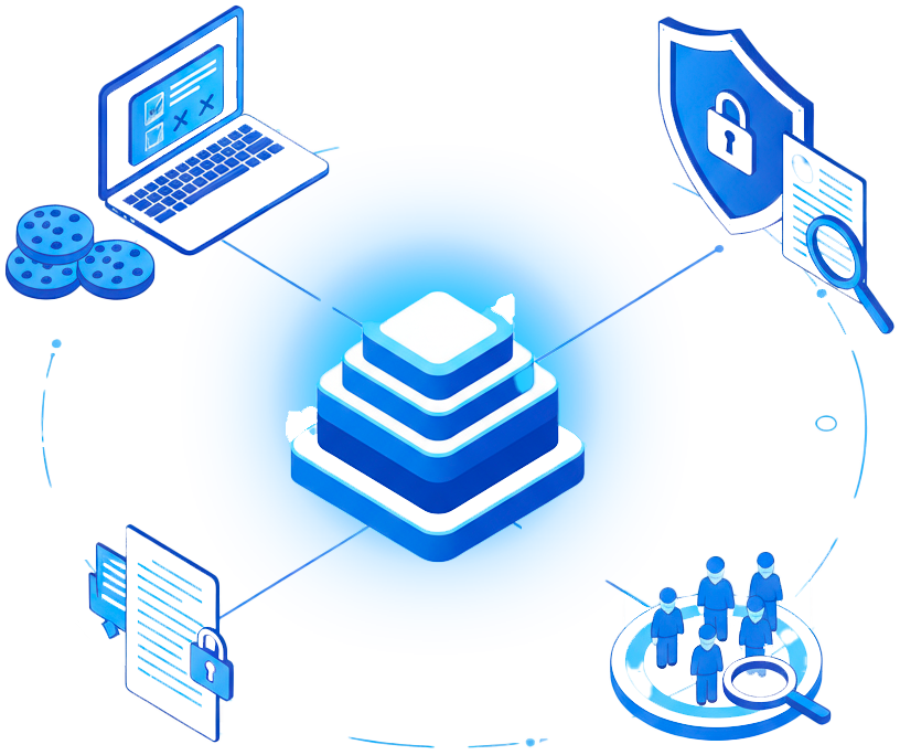 Ela monitora e identifica cookies e rastreadores nos seus sites, permitindo a criação de banners de consentimento alinhados à sua marca, com bloqueio automático de cookies até o consentimento. Além disso, gerencia a criação, atualização e publicação de políticas de privacidade e termos de uso em um único lugar, com rastreabilidade e controle de versões.