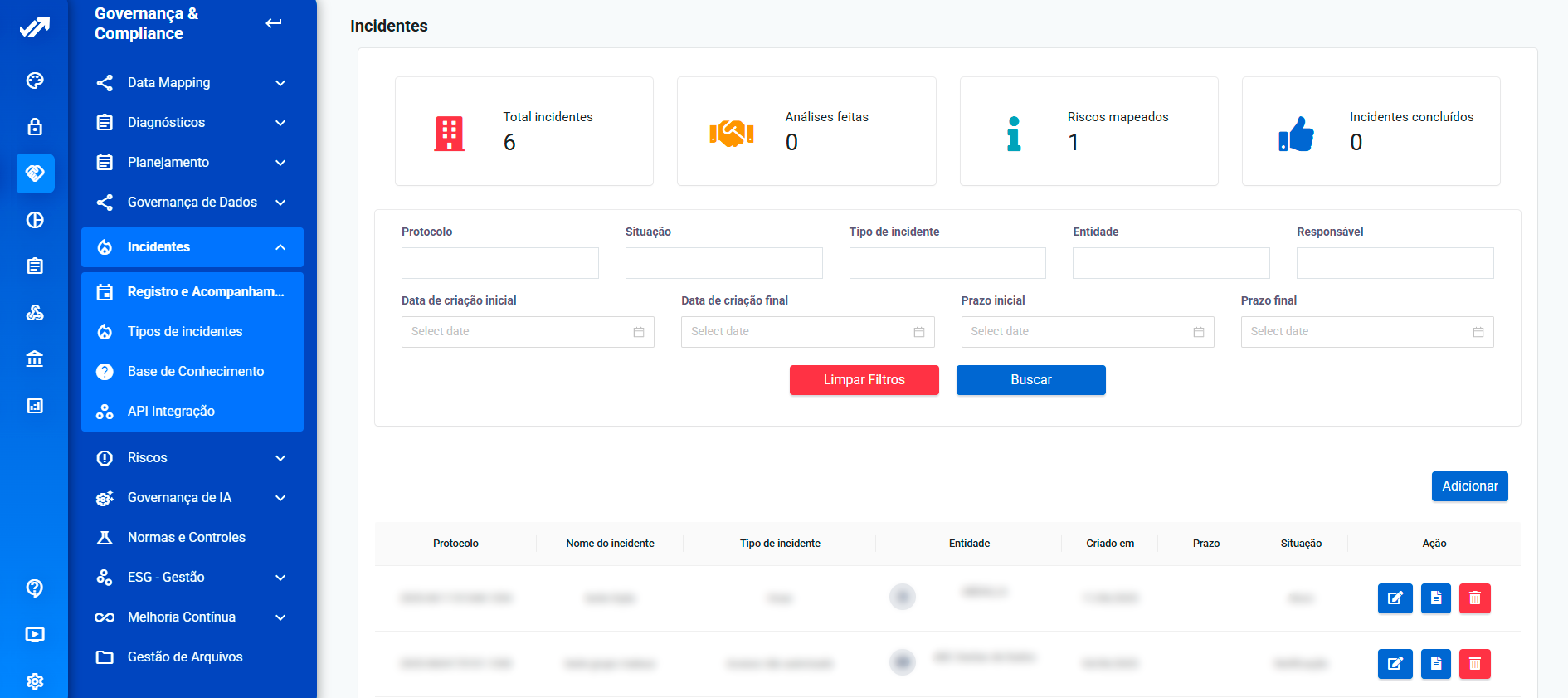 Crie registros com campos personalizados para origem, tipo, impacto, dados afetados e responsáveis, com geração automática de protocolo.