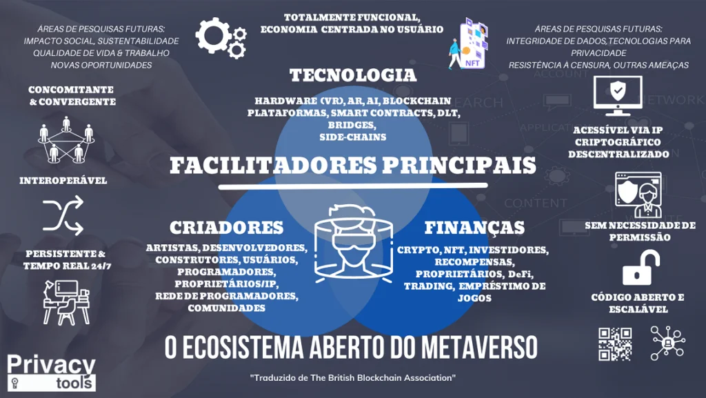 Hardwares, VR, AR, AI, Blockchain, Smart Contracts, DLT, “open source”, Side-Chains, reuniões imersivas, NFTs e vários outros elementos são uma ideia inicial do que faz parte do universo Metaverso. E várias empresas estão, aos poucos, criando ferramentas de modo a estar dentro desse universo.