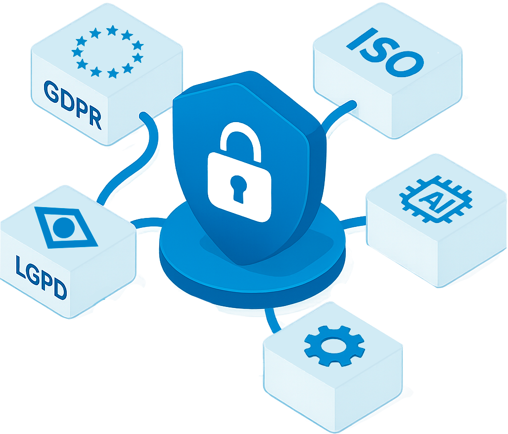 Gerencie GDPR, LGPD, ISO, AI Act e frameworks setoriais em uma plataforma única e integrada.