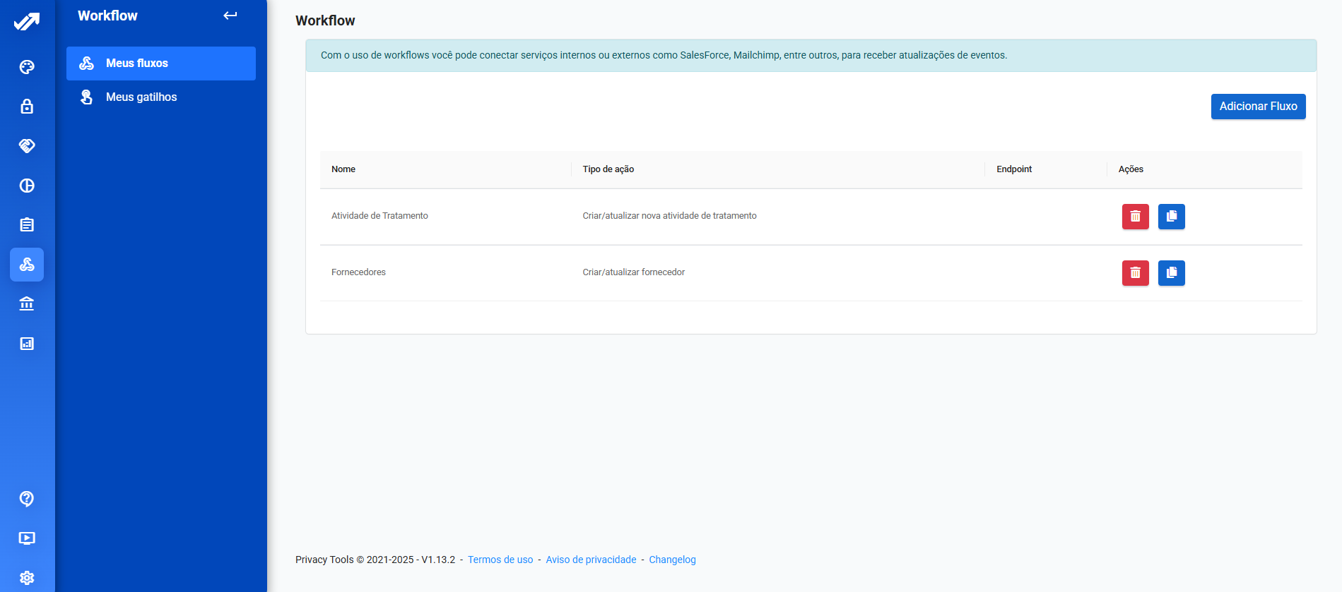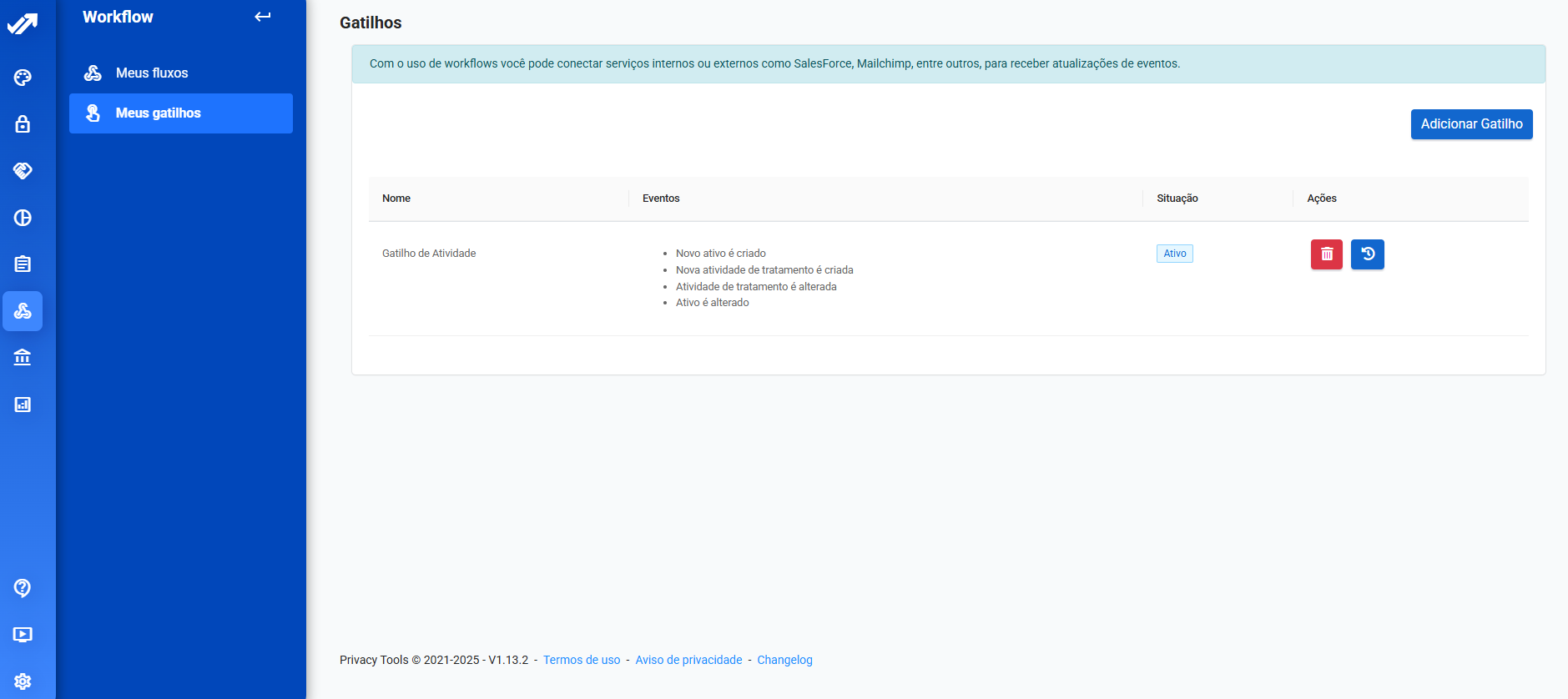 O recurso de Workflow da Privacy Tools permite criar fluxos automáticos com base em gatilhos e condições pré-definidas.